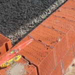 J’ai mis des voliges de bois pour marquer l’angle, ça permet de se poser dessus avec les briques, de faciliter l’aplomb pour que les apprentis maçons que nous sommes en chantier participatif puissent avoir des repères simples. J’avais mis aussi d’autres repères pour l’aplomb, pour faciliter le montage.
