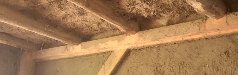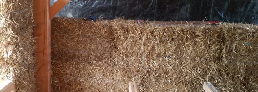 Pour la partie chambre (11m2) : Murs en paille enduits en terre-paille intérieur, terre-paille-chaux à l’extérieur (on change pas une équipe qui gagne)