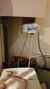 J’aurais pû mettre un mitigeur thermostatique (simple, pas chère) mais soit il aurait fallu être à côté de la machine pour passer à l’eau froide au bon moment soit il aurait envoyé de l’eau chaude même sur le rinçage… mon ballon n’était pas très gros (20L) je n’aurais plus eu d’eau chaude…