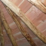 Notre mur en paille n’était pas bien d’aplomb, on avait entre 5 et 15cm de faux aplomb parfois. Et après la pose de la charpente et les problèmes de glissement de perche qu’on a eu, ça c’était largement accentué (10 à 30cm). Une fois qu’on a eu posé la charpente, on a retravaillé le mur en désolidarisant les pieux de la charpente, et en tapant dessus au persuadeur. Une fois le mur « revenu », on refixait le tout ensemble. On a vraiment réussi à bien le redresser, on est maintenant entre 0 et 5cm. C’est pas parfait, mais on est content !