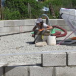Le sous bassement a été fait en blocs de pierre ponce de 30cm, donc on avait déjà un R de 2,7. Pour se rapprocher des performances du mur de paille, et couper un potentiel pont thermique que nous apporterait la lisse basse, nous avons mis une plaque de liège de 6cm (qui à un R de 1,5).