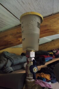 Au départ, j’étais parti pour acheter un vase ouvert, mais pour une si petite installation, je ne trouvais pas vraiment chaussure à mon pied. J’ai fini par percer un verre en plastique et à bricoler un passe paroi de plomberie, ça fait le job… En effet on considère 2-3% d’expansion de l’eau de 0 à 80°C. De mon côté, toute ma tuyauterie abrite ~2L d’eau ; il fallait donc que mon vase ouvert soit capable d’encaisser un différentiel de 2L*3%=0.06L soit 6cl. Même pas besoin d’une pinte !