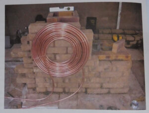 J’ai emprunté une cintreuse à un copain plombier (le 16-18 ça ce tort pas comme ça) et après avoir déroulé mon tuyau de recuit, j’ai fait mes “S”. Une fois mon échangeur en forme, j’ai appliqué une barbotine de terre en accroche sur les briques du poêle. Par précaution, j’ai aussi mis 3 vis à béton pour “porter” l’échangeur (serré avec du fils de fer). J’ai ensuite appliqué une première couche d’enduit terre-sable et, sans attendre que celle-ci soit sèche, j’ai noyé l’échangeur dedans (histoire de maximiser le contact entre le poêle et l’échangeur). J’ai ensuite sanglé des bastaings autour du poêle le temps du séchage. Quand celui-ci a été sec, j’ai appliqué une autre couche d’enduit terre. Bien sûr, cet enduit est tramé pour tolérer la dilatation du cuivre / des briques avec les différences de températures.