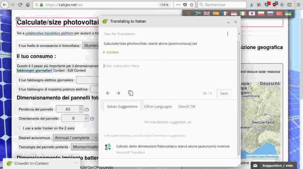 Pour vous en montrer un aperçu de sa puissance, Crowdin permet une traduction « en contexte », directement sur l’interface du site à traduire. A tester sur CalcPvAutonome par ici : calcpv.net/aa