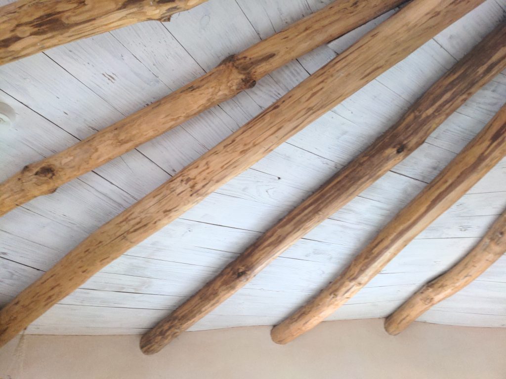 - Châtaignier pour la charpente réciproque (un bois qui contient très peu d’aubier – la partie tendre qui est préférée par ces insectes) ;
