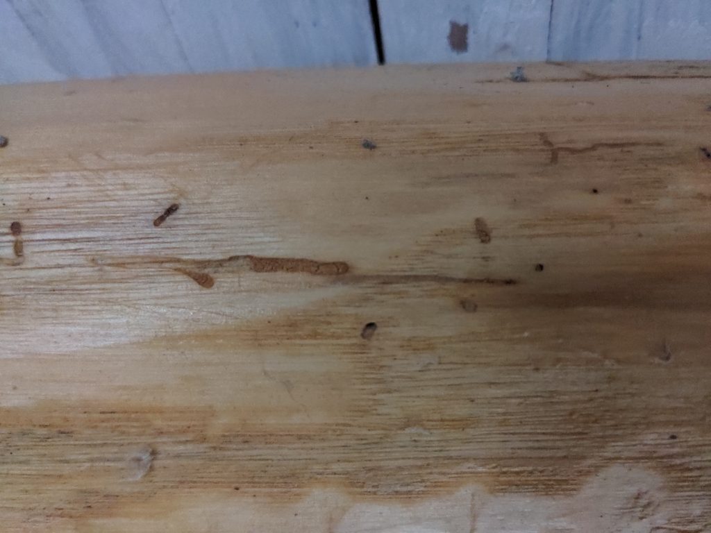 Pour l’instant, c’est surtout le châtaignier qui est contaminé, avec une perche nettement plus touchée + deux petits bouts ailleurs. Le Douglas n’a pas de trace visible (ce qui ne veut pas dire que les larves ne sont pas déjà dedans). Certain expert nous ont dit « étrange c’est rare le châtaigner avec des vrillettes », d’autres ont dit « ha le douglas là il va vite être contaminé », le suivant « ça n’ira pas dans le douglas » l’autre : « probablement que le lait de chaux sur votre douglas a ralenti le passage ».. Bref les cloches ne sonnent pas à l’unissons…