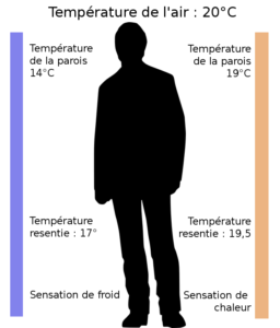 Le thermomètre affiche une valeur qui peut différer de votre ressenti. En effet, la température ressentie est une moyenne entre la température de l’air et la température des parois (temp ressentie = (temp de l’air * temp paroi) / 2). Prenons l’exemple d’une maison en pierre sans isolant, l’hiver. Imaginons que votre mur de pierre soit à 14°, vous allez devoir chauffer à 20° pour avoir un ressenti de 17°. Alors que si la paroi était plus chaude (16° car isolée par l’extérieur par exemple) on atteindrait le ressenti de 17° simplement en chauffant à 18°. L’énergie économisée pour augmenter la température d’un habitat de 2° tout l’hiver est considérable. La température des parois est donc une donnée importante à prendre en compte pour le confort thermique.