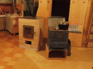 A gauche le poêle d’Agir Low-Tech juste monté et, à droite, le poêle en fonte CHAPPEE