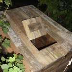 - Le toit est fait de planches de palettes démontées (note : une étanchéité à l’eau complète n’est pas souhaitée) Il ne sera pas fixé mais le retour de toiture sera de dimension exacte afin de le faire glisser en force (le poids faisant le reste) ;