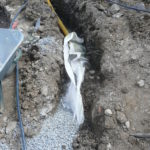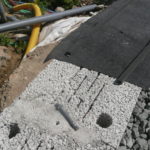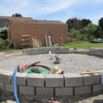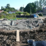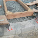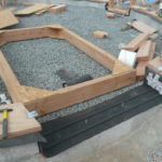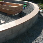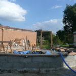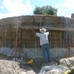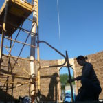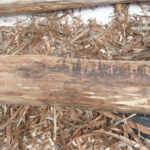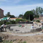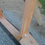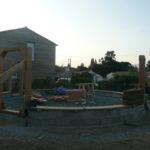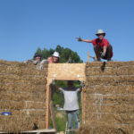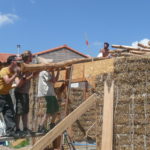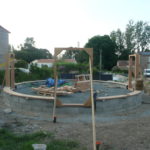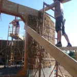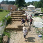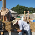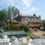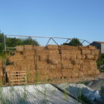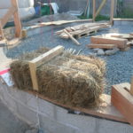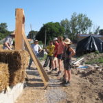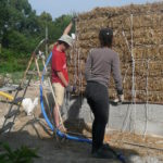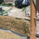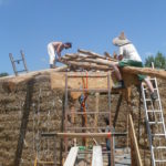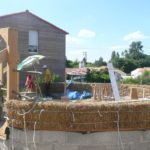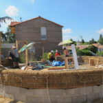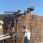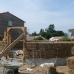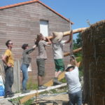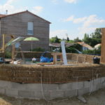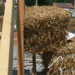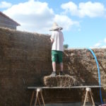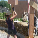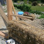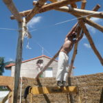 Notre mur en paille n’était pas bien d’aplomb, on avait entre 5 et 15cm de faux aplomb parfois. Et après la pose de la charpente et les problèmes de glissement de perche qu’on a eu, ça c’était largement accentué (10 à 30cm). Une fois qu’on a eu posé la charpente, on a retravaillé le mur en désolidarisant les pieux de la charpente, et en tapant dessus au persuadeur. Une fois le mur « revenu », on refixait le tout ensemble. On a vraiment réussi à bien le redresser, on est maintenant entre 0 et 5cm. C’est pas parfait, mais on est content !