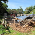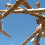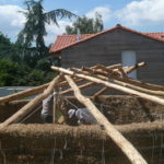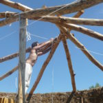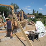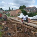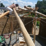 On a eu quelques difficultés, les perches principales ont glissé, notamment au moment ou nous avons cherché à mettre la dernière. Le poteau vertical était peut-être mal placé, du coup quand on a cherché à la rentrer, ça a forcé et ça a tout fait bouger. On a mis un peu de temps à tout remettre. Peut-être que c’était dû au fait que nos perches étaient huilées. En tout cas, Gurun à conclu que pour une grosse charpente comme ça il faudrait peut-être s’affranchir des ficelles et mettre directement les tire-fonds pour éviter que ça bouge…