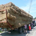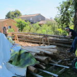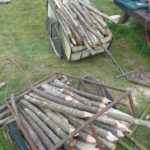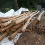 Nous avons choisi nos perches de châtaigner par une belle matinée de Février chez Marco (un voisin) qui entretien un petit taillis. Le transport s’est fait avec une grande remorque plateau, c’était une grosse journée car chaque perche pèse plus de 100kg et mesure ~6m50 de long.
