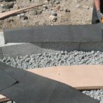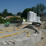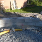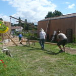 Pour hisser les perches nous avons fait une « rampe » avec un tréteau/échafaudage de maçon, de façon à ce que la perche passe au dessus du mur.
