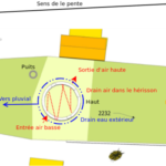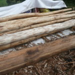 Du coup, on a dû les rependre légèrement et on a décidé de les protéger directement. Donc on a appliqué un primaire anti-tannique et une couche d’huile de lin rapidement après écorçage afin de protéger le bois. On a aussi amélioré le stockage, on a mis une bâche en dessous (pour éviter les remontées d’humidité du sol), et une bâche par dessus (pour éviter que le bois ne grise trop rapidement avec le soleil) et on a aménagé une lame d’air pour que ça respire… Comme ça, nos perches (qui seront apparentes) sont restées belles.