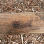 Au départ, après écorçage, nous les avions stockées sur des bastaings de bois, sous bâche. Mais il y a eu une période très humide et il y a eu énormément de remontées tanniques :