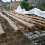 Ensuite, on place les 12 perches secondaires. Les secondaires répartissent la charge sur le murs et permettent d’avoir moins d’entraxe pour poser le toit.