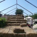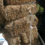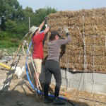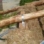- Fixer la perche sur le mur : nous avons mis une broche de châtaigner dans le 5ème rang de botte de paille, en haut du mur, que nous avons encerclé d’un bout de feuillard métallique (lame de fer plate pré-percée), vissé à la perche de charpente.