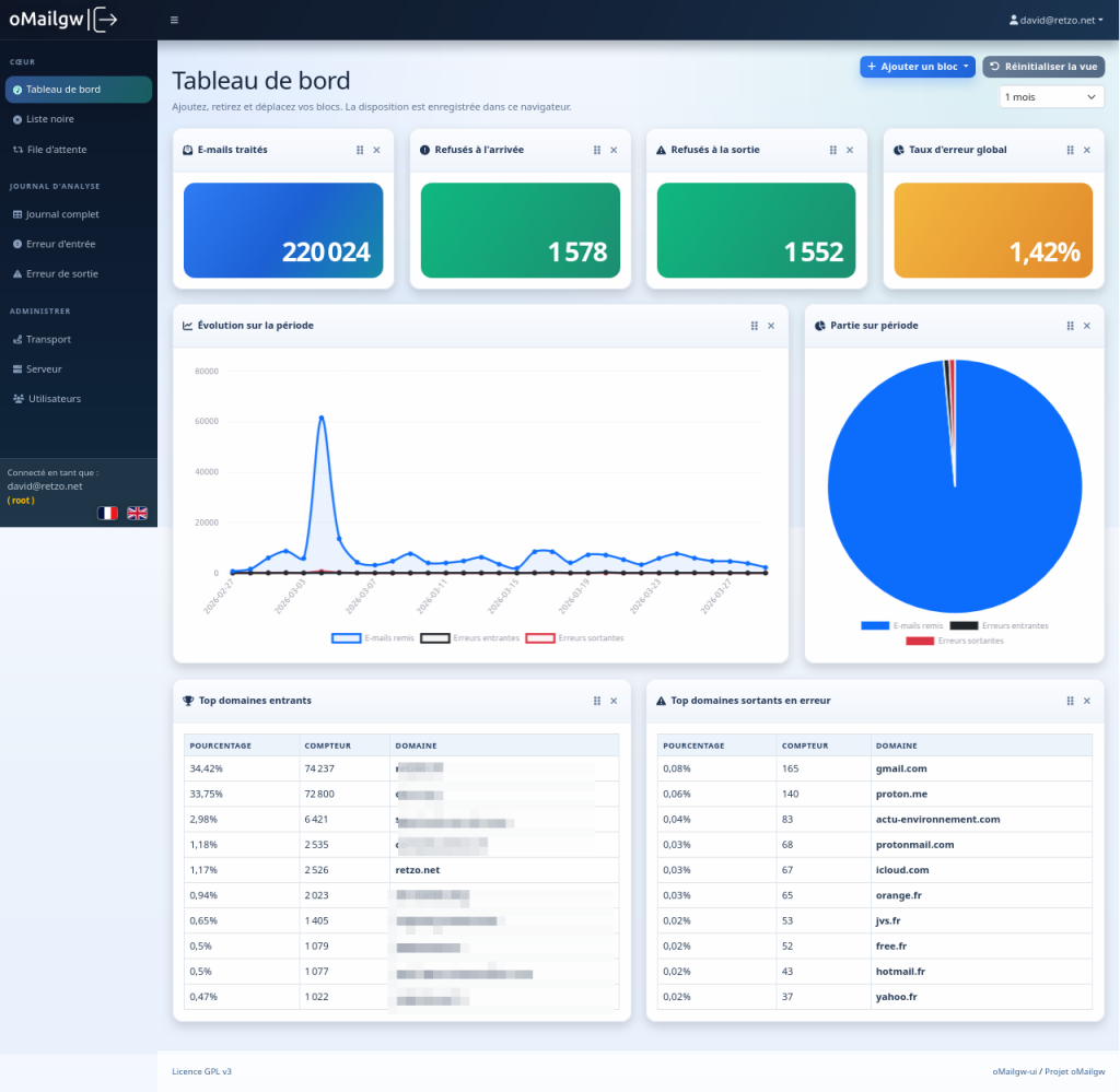 oMailgw est un logiciel libre que je développe pour répondre à un besoin très concret : gérer, superviser et partager une ou plusieurs passerelles e-mail sortantes basées sur Postfix.